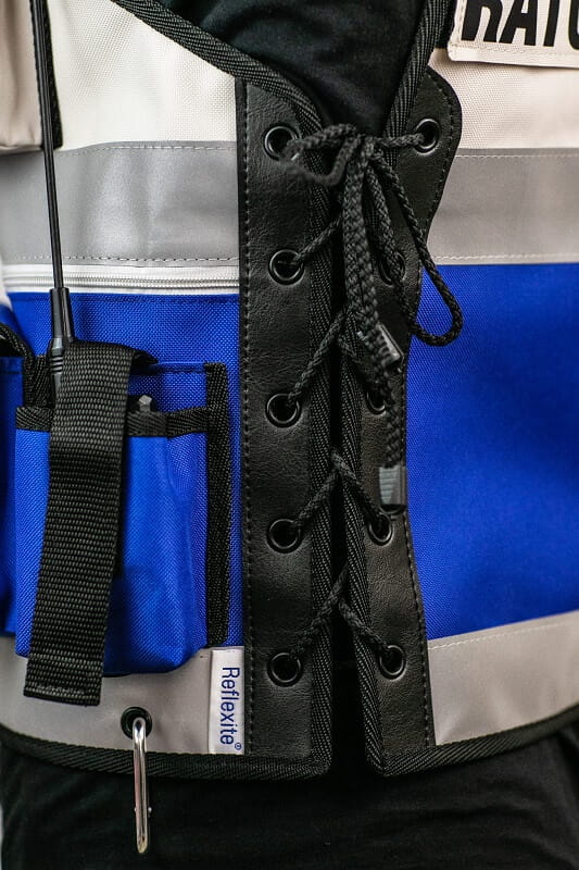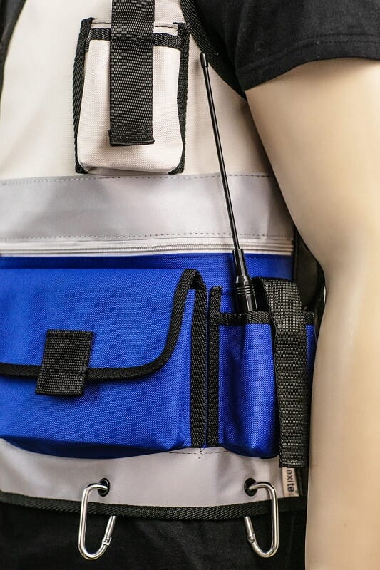 - Kamizelka posiada możliwość podpięcia zestawów medycznych z prawej lub lewej strony (w zestawie 2 sztuki karabińczyków)