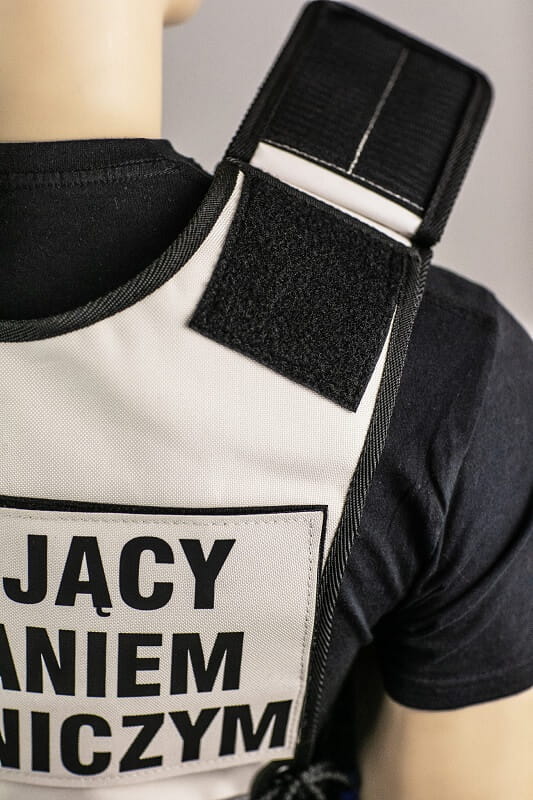 - Posiada regulację długości na rzep (patki na ramionach) i szerokości na sznurki